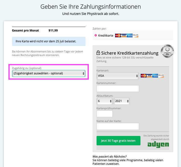 Registrieren Sie sich bei Physitrack, so wie es auf der Registrierungsseite verlangt wird. Wenn Sie zum Zahlungsschritt gelangen, geben Sie nun als ersten Schritt Ihre Zugehörigkeit an - wählen Sie dazu das dafür vorgesehene Feld aus und klicken Sie im Drop-Down-Menü auf die Option 'ePhysio'.